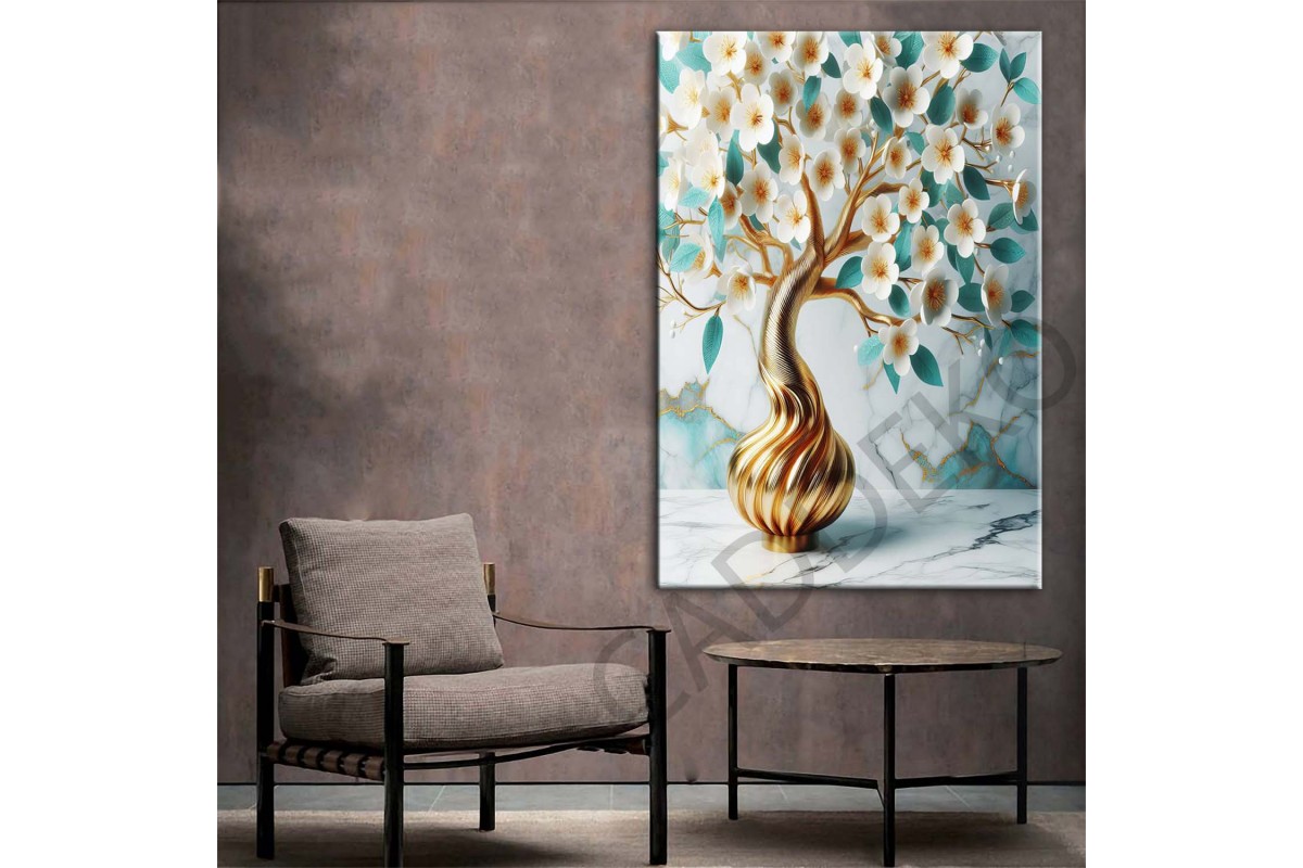 Beyaz Turkuvaz Uzakdoğu Çiçekleri Gold 2 Dekoratif Kanvas Tablo dkmr448